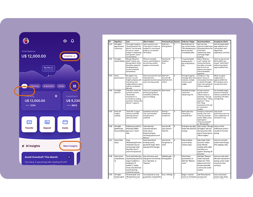 Process: A structured prompt was created combining heuristics analysis, accessibility review, and task evaluation. Screens were uploaded, the analysis was generated, and the output was reviewed as a prioritized report with issues, severity, reasoning, and suggested fixes.